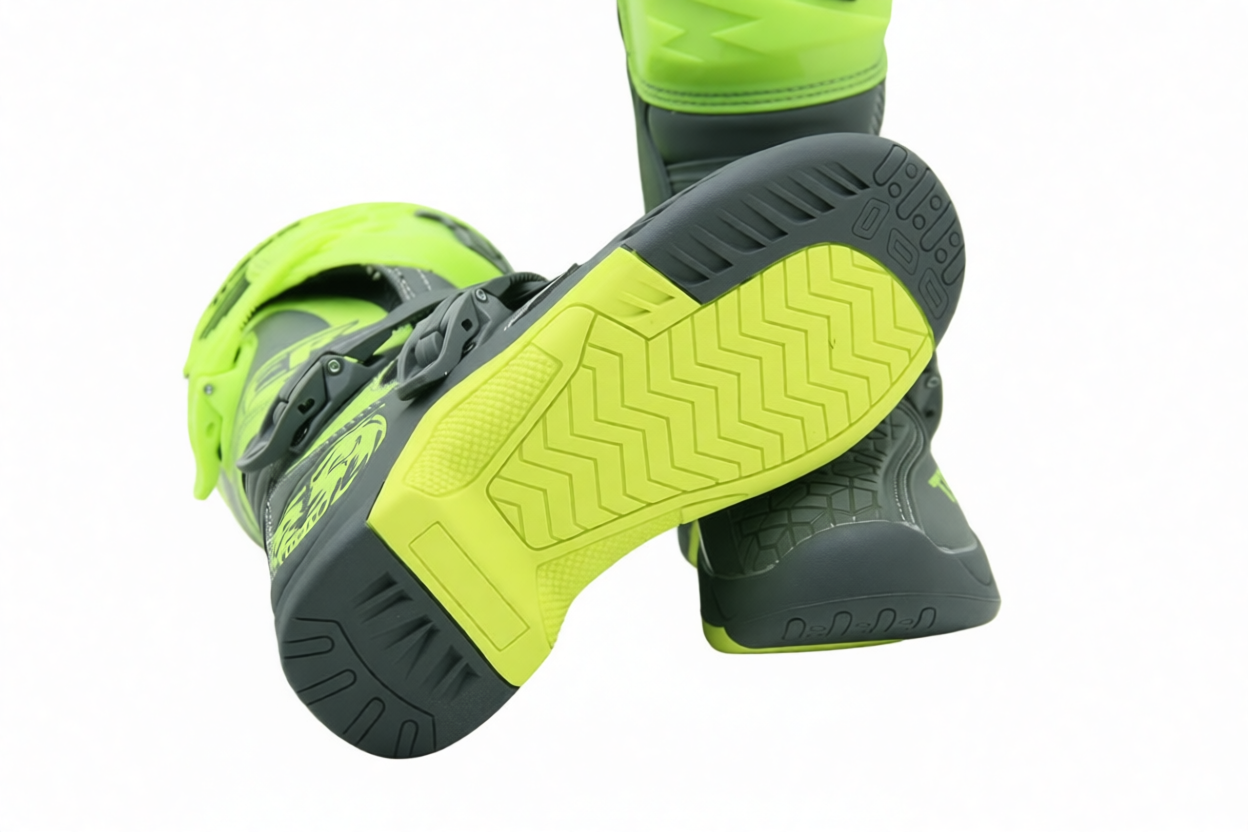 Мотоботы для эндуро TIGER MTR TE006 изготовлены из кожи и высококачественного синтетического материала. Для обеспечения удобства и комфорта в использовании оснащены четырьмя сменными застежками на ремнях, регулируемых по длине, Сплошная, резиновая подошва имеет прошивкут и антискользящий, направленный рисунок. Материал голенища и подошвы изготовлен из масло-бензостойкого материала. Мотоботы обеспечивают превосходную защиту голени и стопы за счет литых элементов пластиковой защиты и усиленного носка со стальным наконечником. Вставки из термоустойчивой замши на внутренней стороне голенища обеспечивают защиту от горячих частей мотоцикла. Влагонепроницаемая и дышащая подкладка DryTech внутри мотобот создает комфорт при носке. Мотоботы имеют эргономичный дизайн и яркую раскраску. Гофрированные вставки на изгибах голенища обеспечат удобство управления кроссового и эндуро мотоцикла.
