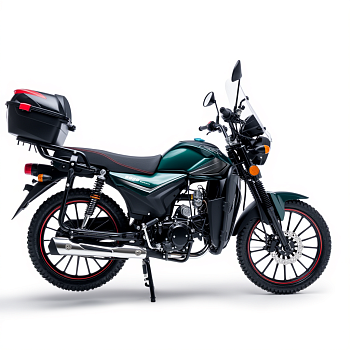 Система запуска включает как электростартер, так и кикстартер, что удобно в любых ситуациях. Подвеска воздушного типа сглаживает неровности дороги, а диаметр колёс 17 дюймов обеспечивает устойчивость и уверенное управление.