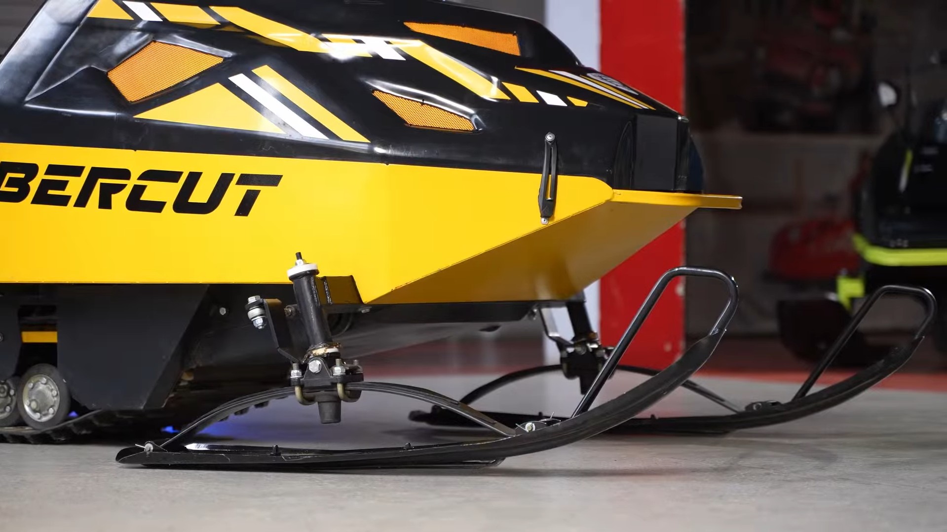 шкворни лыж зафиксированы под углом, что снижает валкость снегохода, обеспечивает ему лучшую управляемость и маневренность.